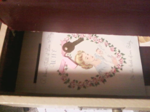 There was a hidden compartment in the bottom...and looky what I found...the sweetest little card and the KEY, which the man didn't realize was there.